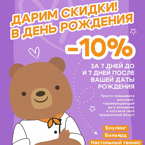 Скидка действует за 7 дней до и после Вашей даты рождения в зонах: бильярд, боулинг, настольный теннис, сквош и тир!